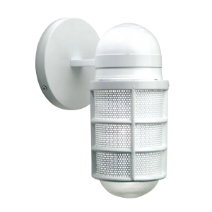Cast aluminum grill and fittings. Clear glass enclosure. 5" diam. x 1/2" deep canopy. For standard wall junction box mounting. -